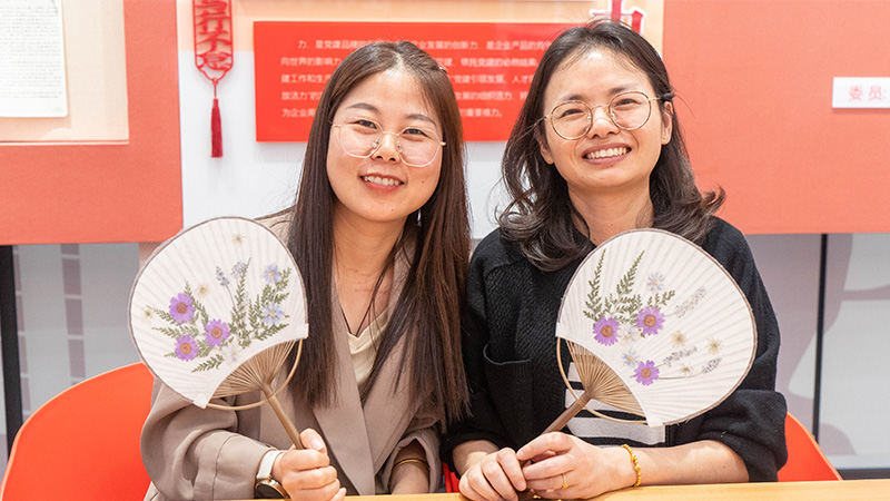 在老師的指導下,員工們(men) 紛紛動手,將一朵朵精心挑選的鮮花押在團扇上。大家一邊製作團扇,用雙手傳(chuan) 遞著對母親(qin) 的深情厚意,一邊交流心得,體(ti) 驗著傳(chuan) 統手工藝的樂(le) 趣。